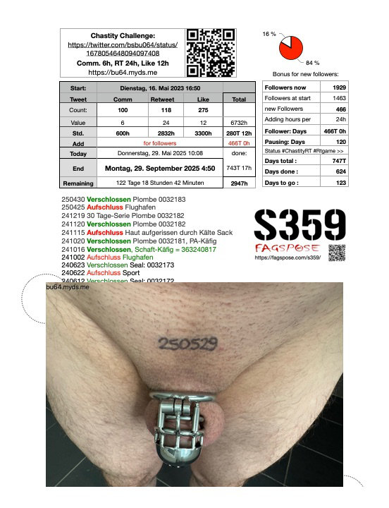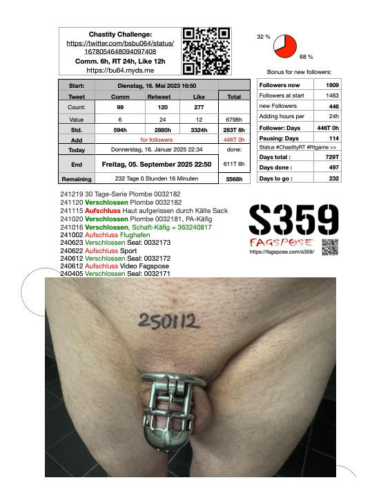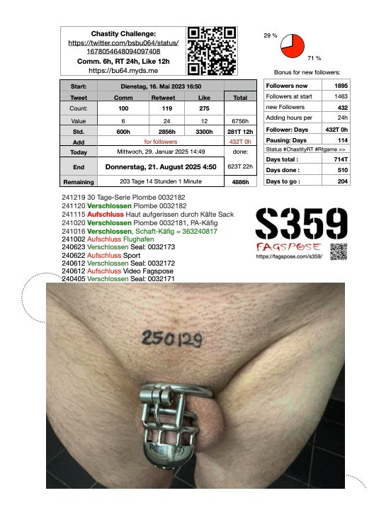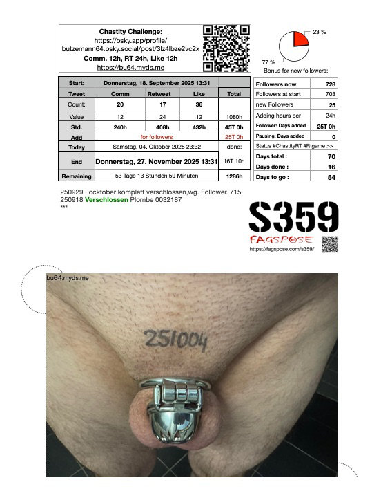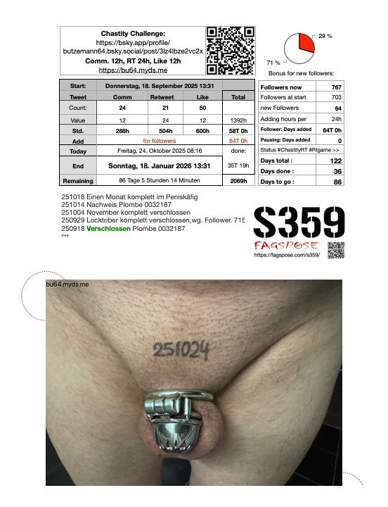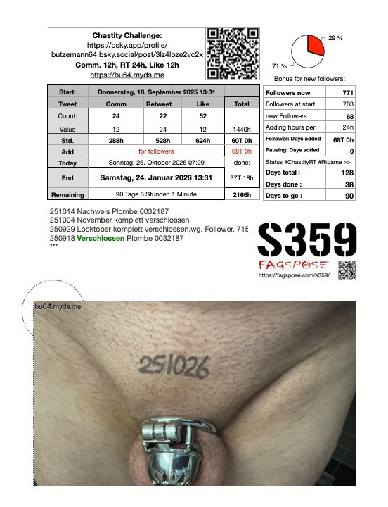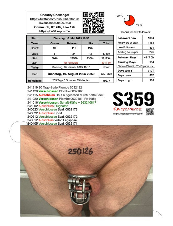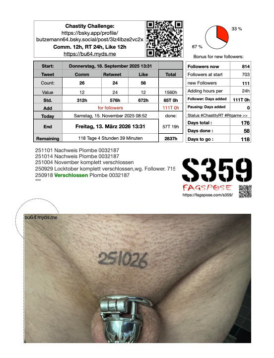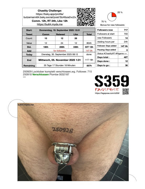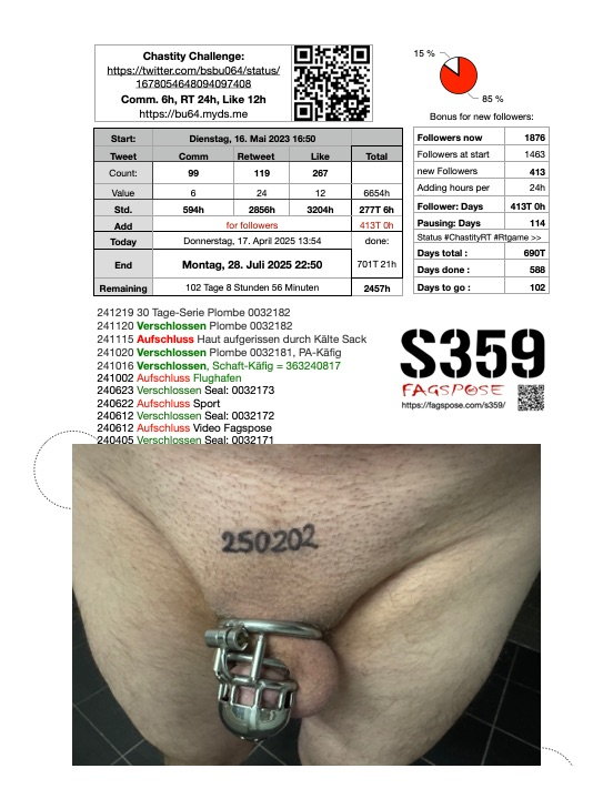 In ca. 18 Tagen hat der Sklave durch peinliches Outing auf seiner Homepage alle Strafpunkte abgebaut. Jetzt geht es halt wieder aufwärts- Bis 30.11. werden die Zugriffe mit je 10 Strafpunkten belegt.