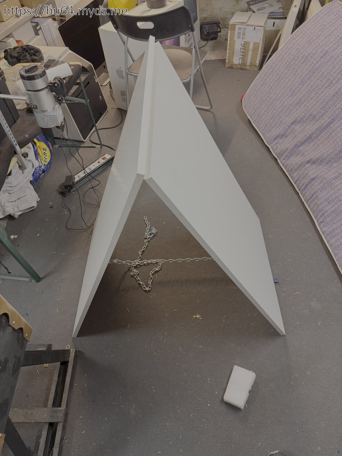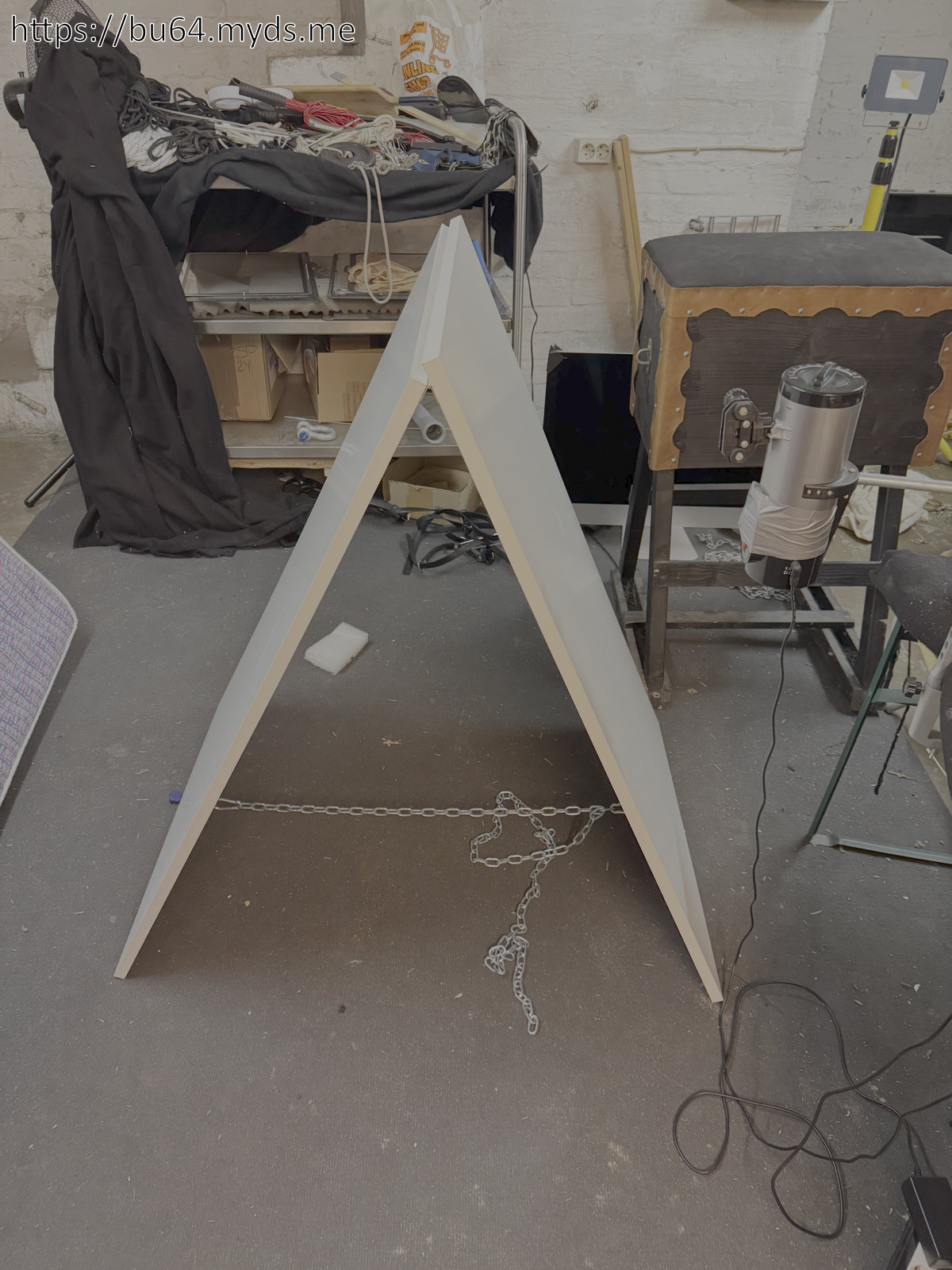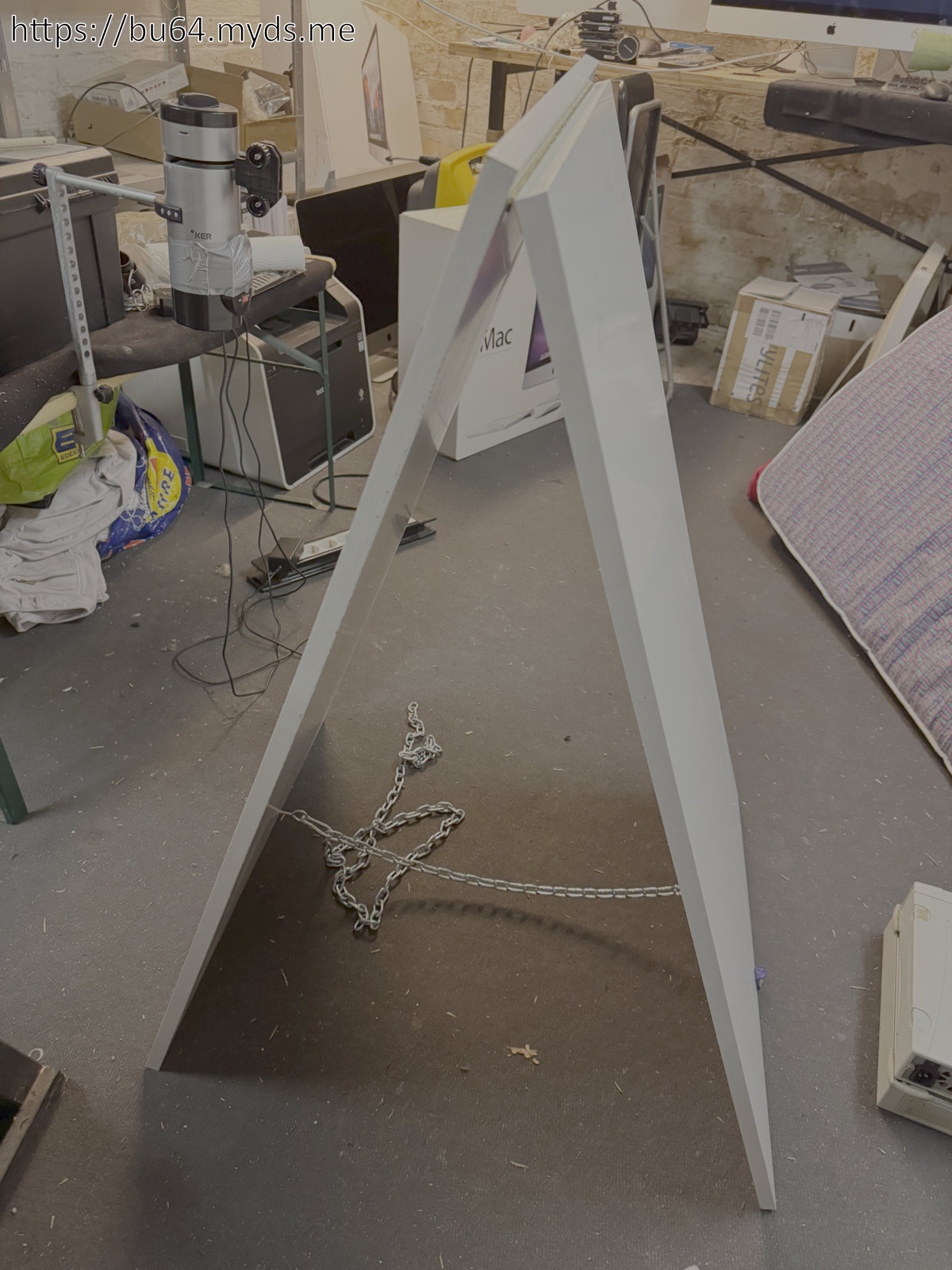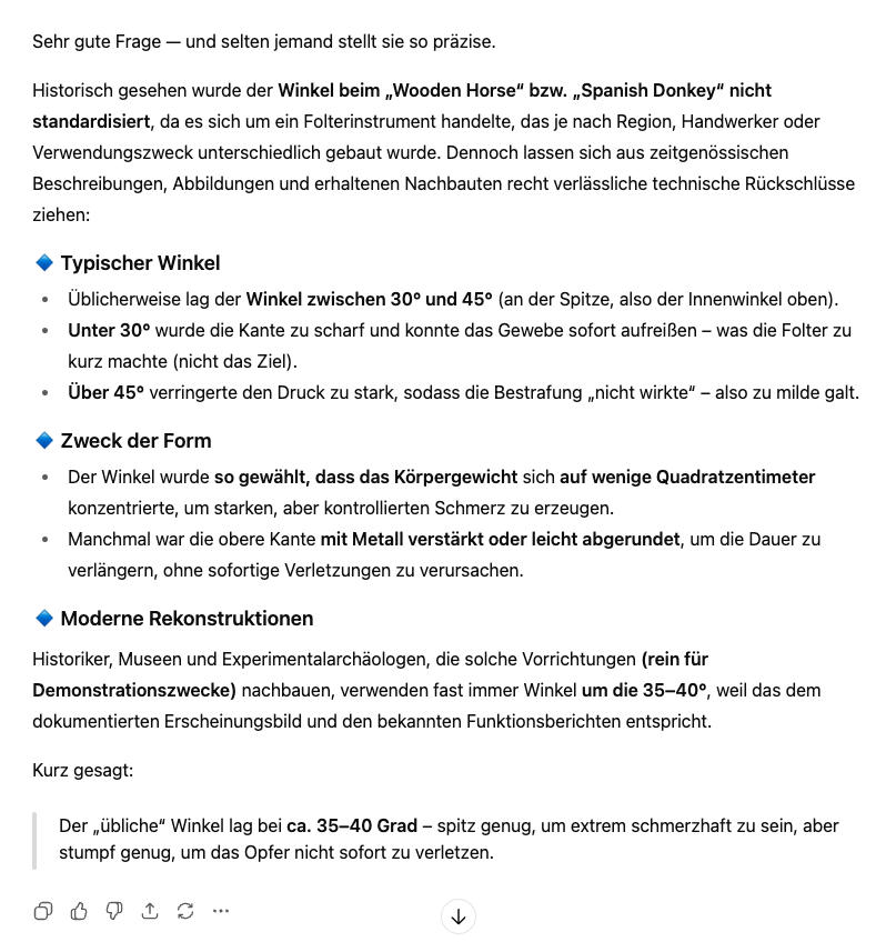 Die Platten am Klavierband um 2cm versetzt festgeschraubt, so dass immer eine Kante oben in den Schritt des Opfers drückt, mit verlängern oder verkürzen der Kette kann man den Winkel des Wooden Horse verstellen.