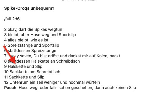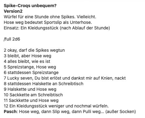 Meister hat mir eine Liste gemacht, ich darf würfeln, aber es hat seinen Preis. Zum Beispiel den weißen Adidas Sportslip tragen und die Spreizstange zwischen den Beinen. Auch unbequem, nach einer Stunde kamen die Spikes wieder dran.