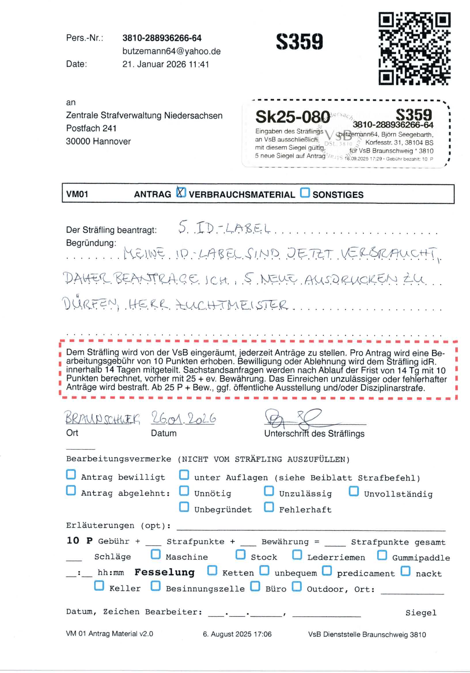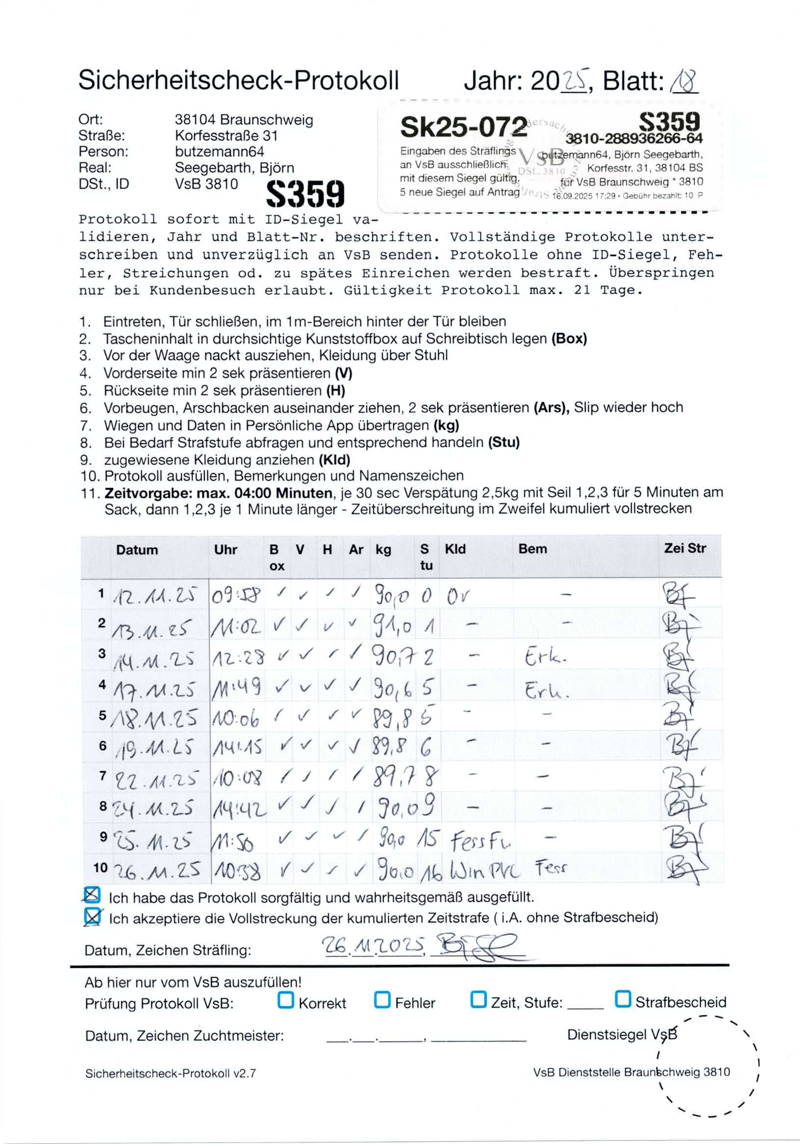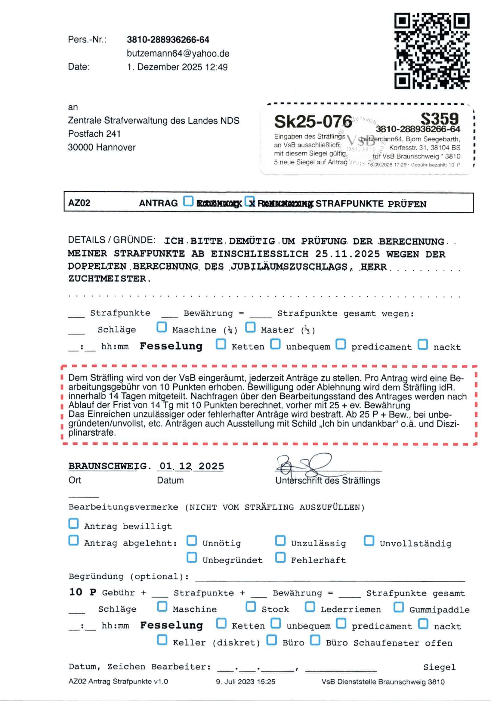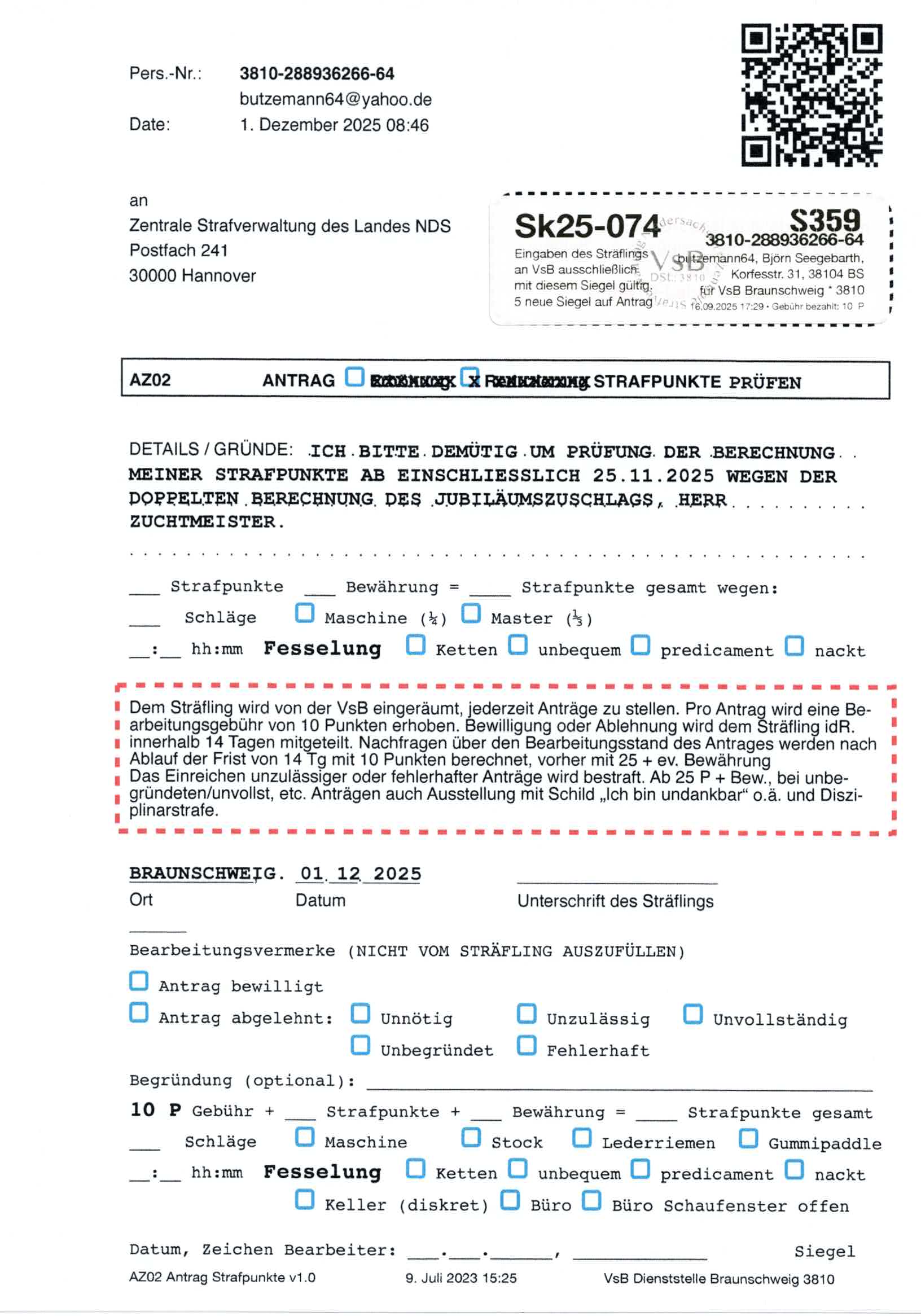 Ich beantrage eine Prüfung der Strafpunkte ab 25.11.2025 bei der VsB, Meister. Antrag kommt, sobald ich im Büro bin, da liegen die ID-Label.