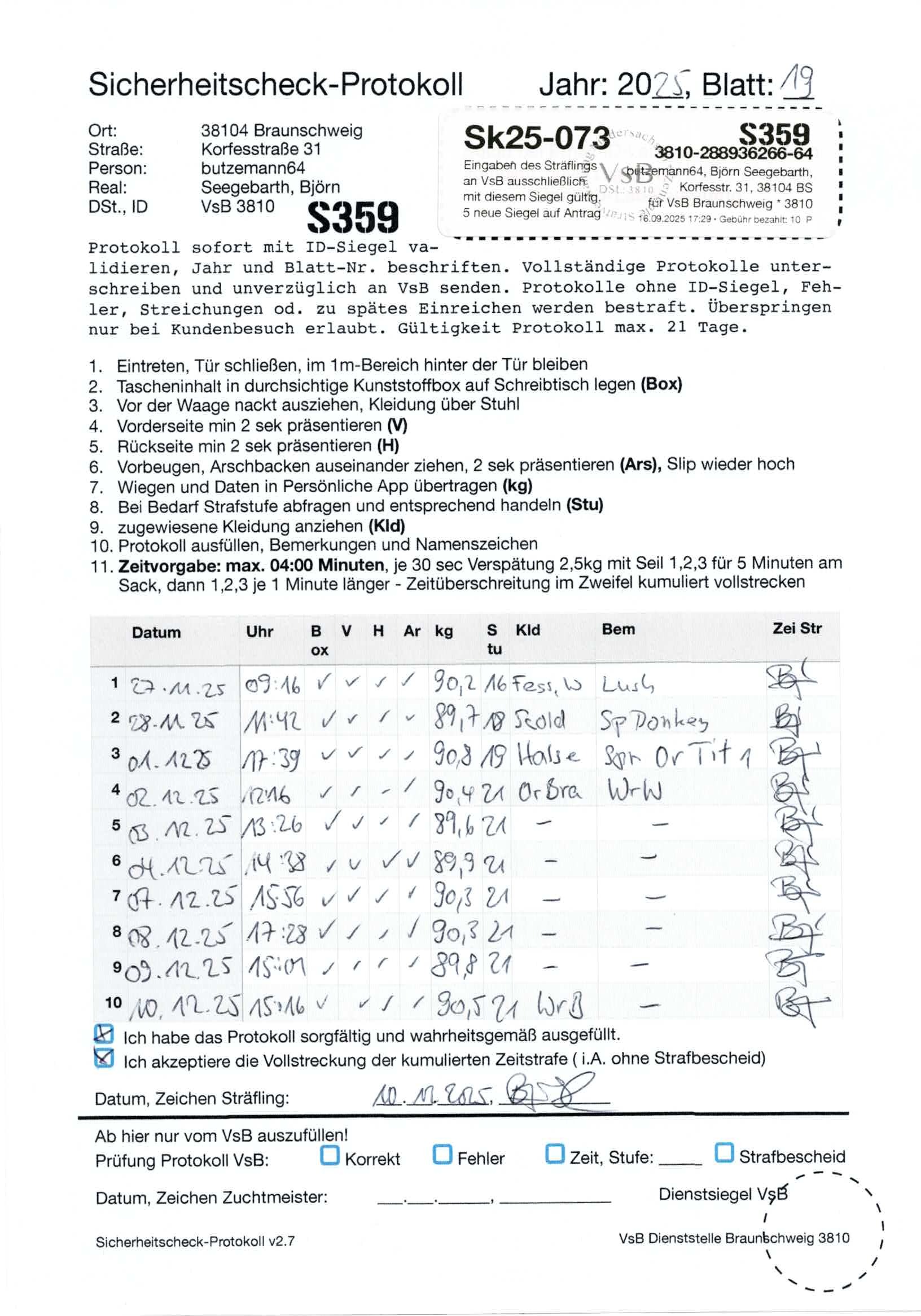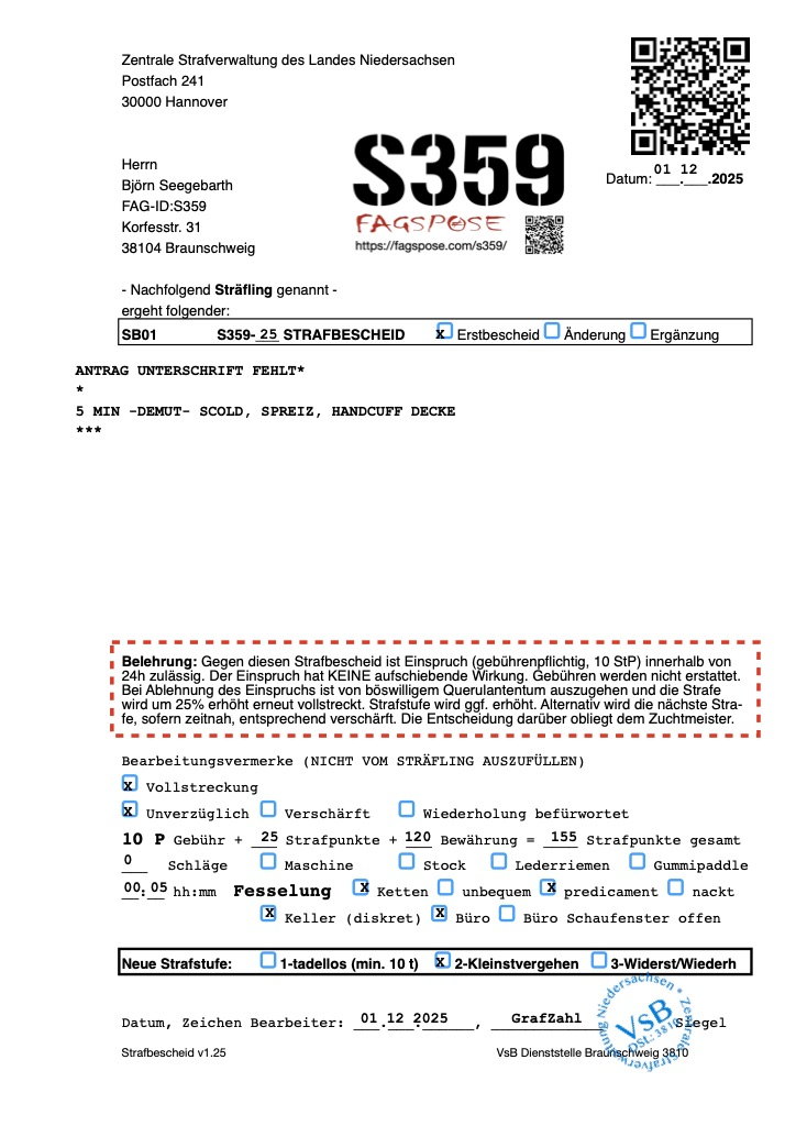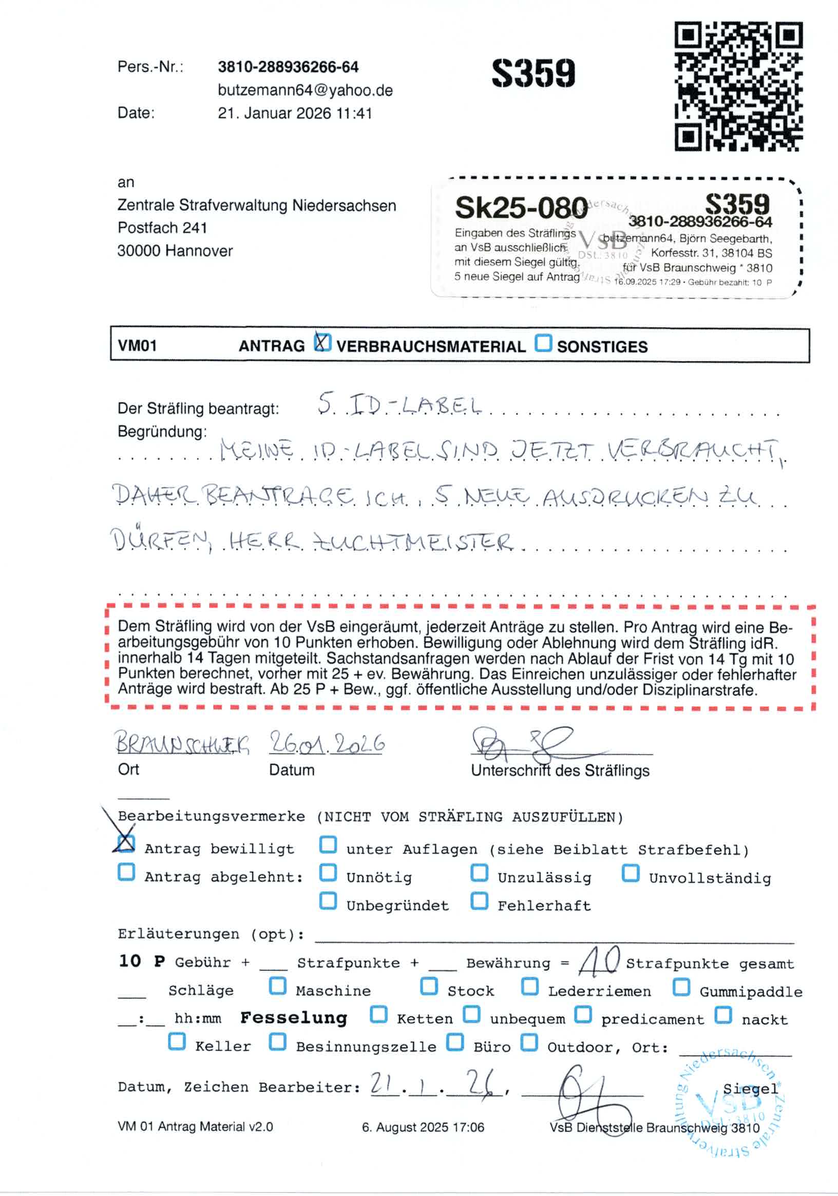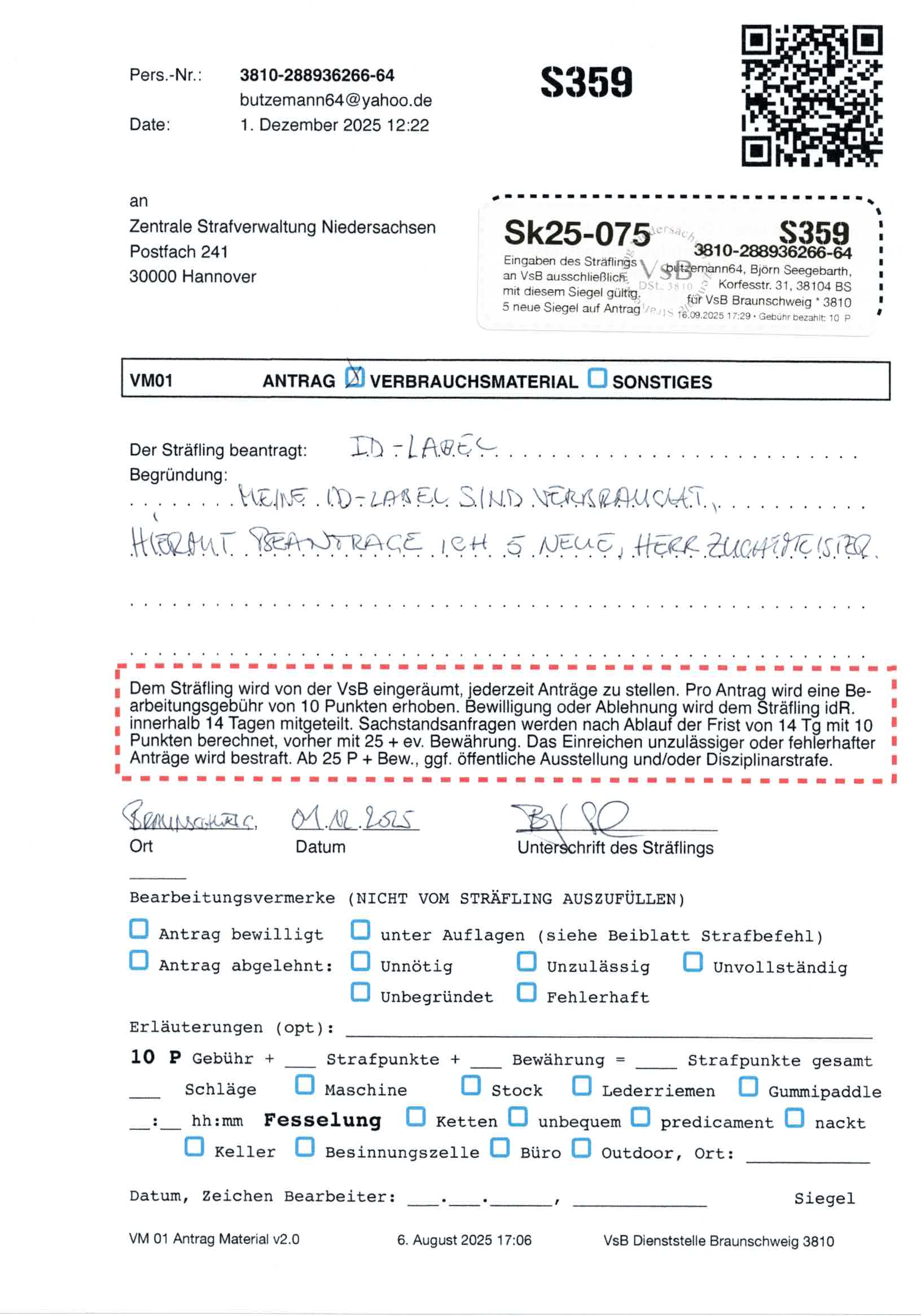Ich beantrage eine Prüfung der Strafpunkte ab 25.11.2025 bei der VsB, Meister. Antrag kommt, sobald ich im Büro bin, da liegen die ID-Label.
