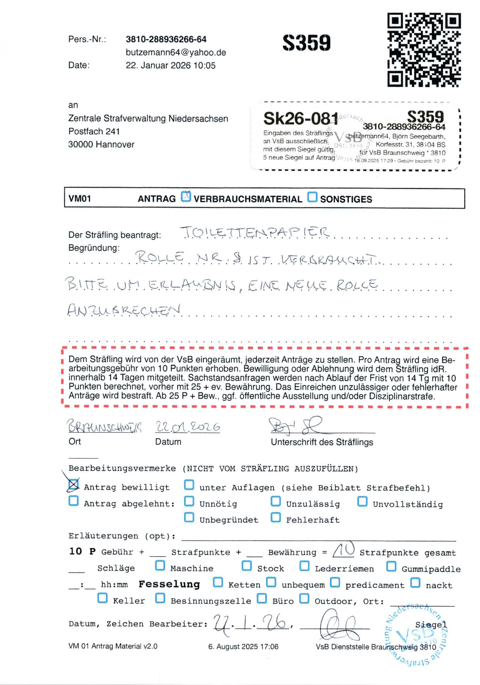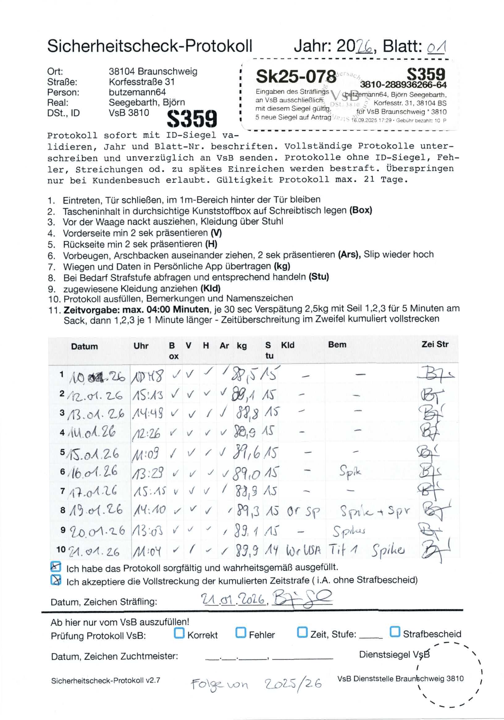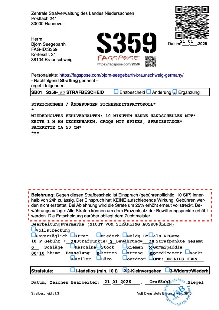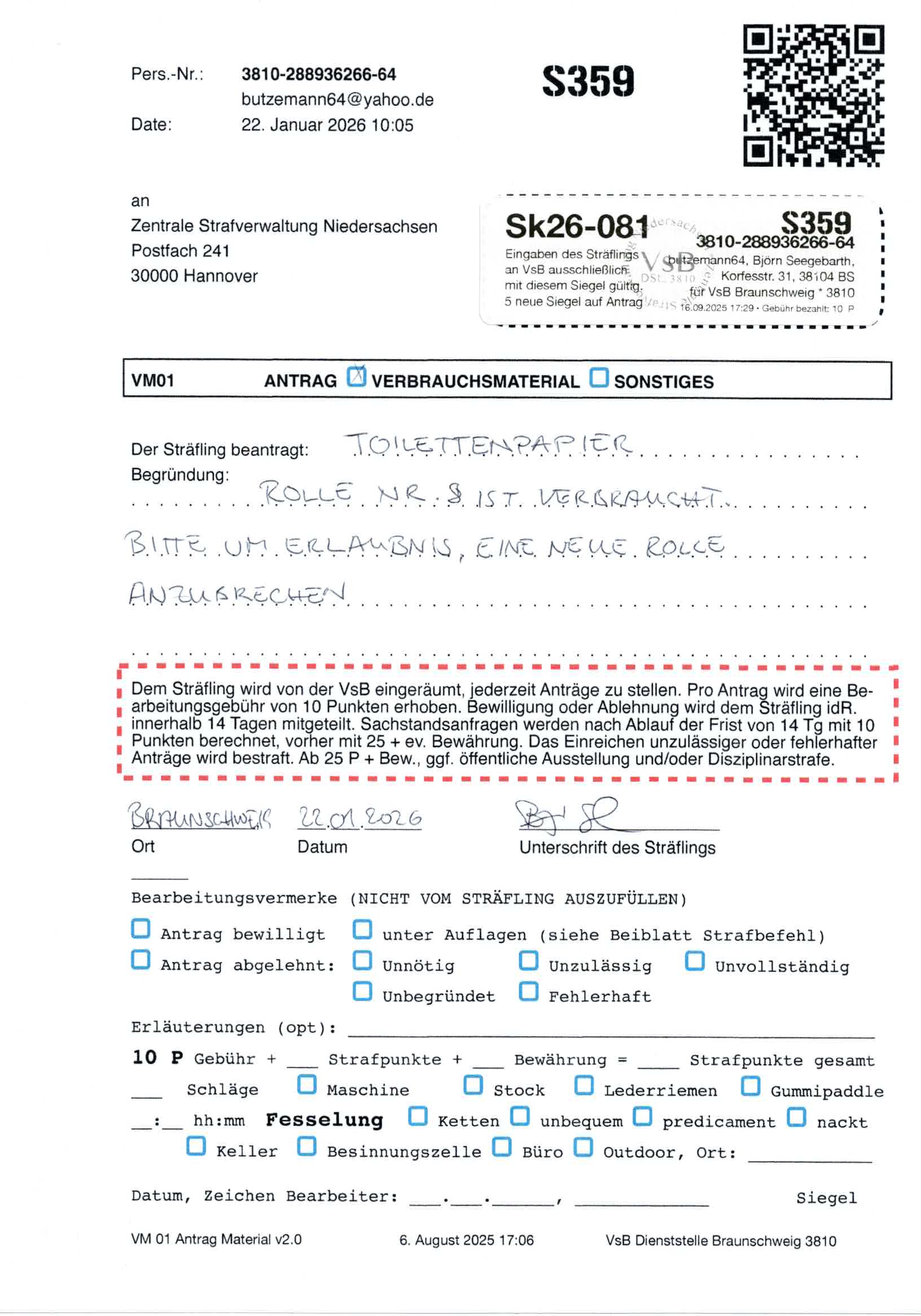 Ich beantrage eine Prüfung der Strafpunkte ab 25.11.2025 bei der VsB, Meister. Antrag kommt, sobald ich im Büro bin, da liegen die ID-Label.